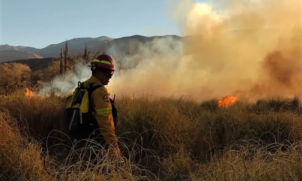 Combatientes de Incendios Forestales del Ministerio de Ambiente y Cambio Climático se encuentran trabajando en un incendio de pastizales activo en el Cerro Azul, en cercanías al Parque Provincial Potrero de Yala, pero fuera del área provincial protegida.