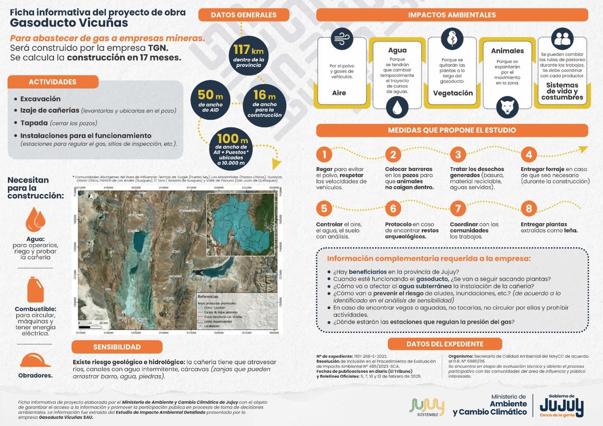 En el marco del procedimiento de evaluación de impacto ambiental, la Secretaría de Calidad Ambiental del Ministerio de Ambiente y Cambio Climático de Jujuy, a través de su Dirección de Evaluación Ambiental y Fiscalización, organizó una serie de reuniones informativas y técnicas relacionadas con el proyecto Gasoducto Las Vicuñas cuyo objeto es abastecer de gas a empresas mineras.