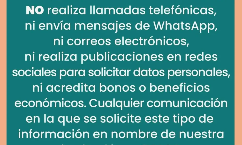 Desde esta institución NO se realizan llamadas telefónicas, no se envían mensajes de WhatsApp ni correos electrónicos ni se realizan publicaciones en redes sociales para solicitar datos personales, ni ofrece bonos o beneficios económicos a través de estos medios. Cualquier comunicación en la que se solicite este tipo de información es FALSA.