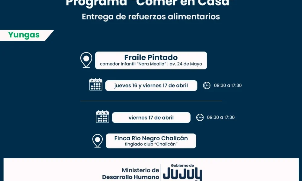 El Ministerio de Desarrollo Humano, a través de la Secretaría de Asistencia Directa, comunica que, desde el jueves 16 de abril, se llevará a cabo la entrega directa de módulos alimentarios del Programa “ Comer en Casa”, a familias de esta localidad de Yungas.