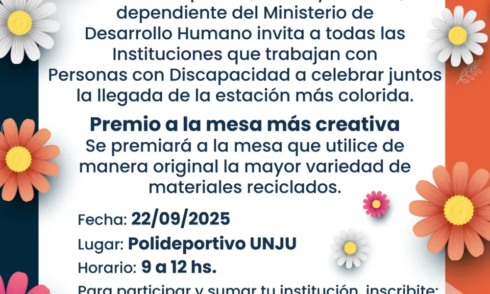El Ministerio de Desarrollo Humano de Jujuy, a través del Centro Deportivo, Social y Cultural, invita a todas las instituciones que trabajan con Personas con Discapacidad a participar de la jornada “Bienvenida Primavera”, una celebración pensada para compartir y dar la bienvenida a la estación más colorida del año.