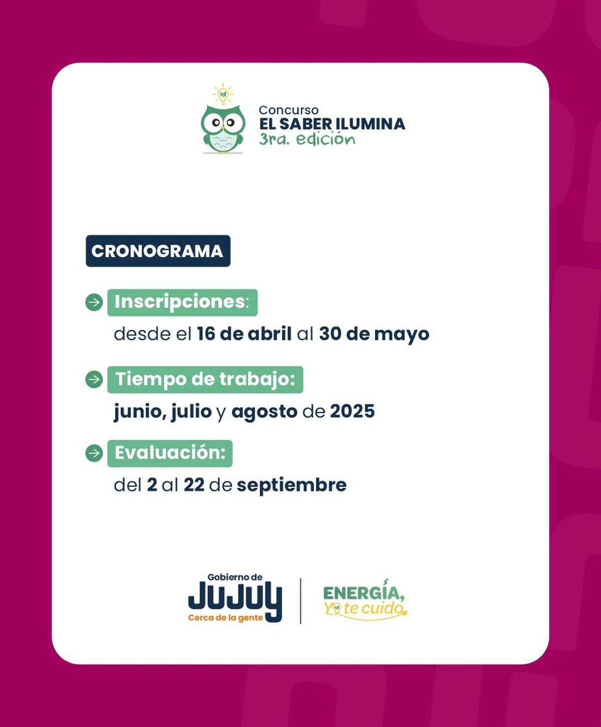 El miércoles 16 de abril se abren las inscripciones al concurso ‘El Saber Ilumina’, por el que el Gobierno de Jujuy, desde la Secretaría de Energía y el Ministerio de Educación, convoca a las comunidades educativas a una participación creativa y de prácticas por la eficiencia energética.