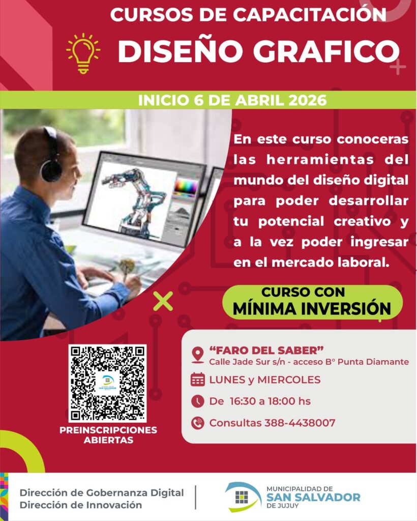La Municipalidad de San Salvador de Jujuy, a través de las direcciones de Gobernanza Digital y de Innovación de la Secretaría de Planificación y Ambiente, pondrá en marcha el próximo lunes 6 de abril nuevos talleres de capacitación en “Diseño Gráfico” y “Reparación de Celulares”, que se dictarán en el Faro del Saber, ubicado en calle Jade Sur s/n, acceso a Punta Diamante.