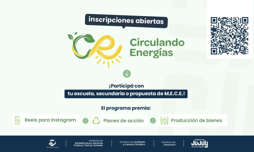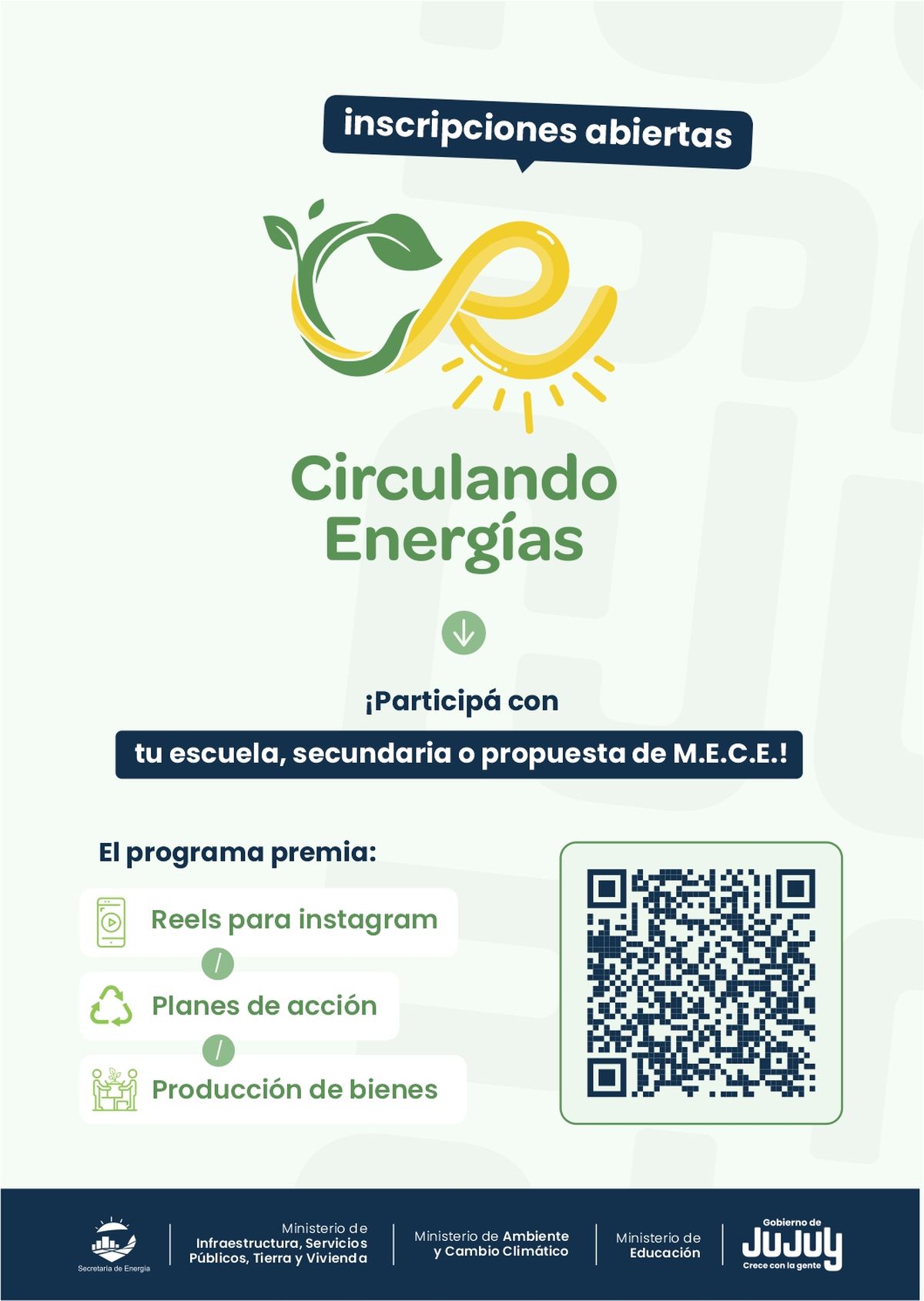 El Gobierno de Jujuy, a través de los Ministerios de Infraestructura, Servicios Públicos, Tierra y Vivienda (MISPTyV), de Educación y de Ambiente y Cambio Climático, informa que se encuentran abiertas las inscripciones para participar del Programa «Circulando Energías», e impulsado por la Secretaría de Energía del MISPTyV.