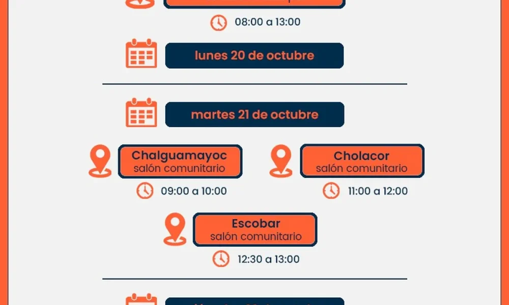 • Martes 21 de octubre, en Chalguamayoc, en el Salón Comunitario de 9 a 10 horas; en Cholacor, en el Salón Comunitario de 11 a 12 horas; y en Escobar, en el Salón Comunitario de 12:30 a 13 horas.