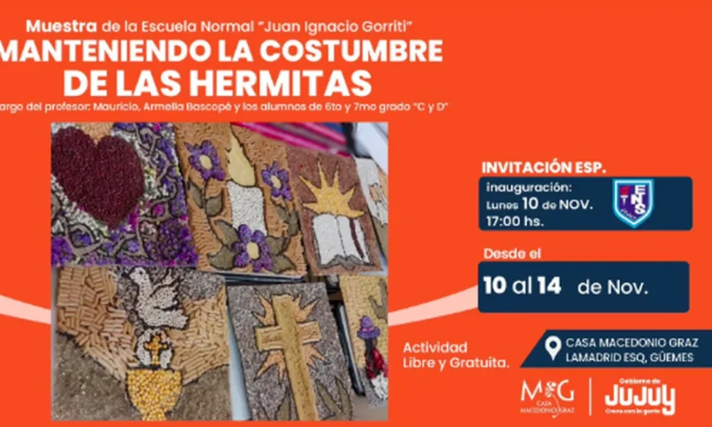 La muestra «Manteniendo la Costumbre de las Hermitas» se inaugurará a las 17 horas en Casa Macedonio Graz, ubicada en Lamadrid esquina Güemes de la localidad de Güemes, y permanecerá abierta hasta el 14 de noviembre. El proyecto estuvo a cargo de los profesores Mauricio y Armella Bascopé junto a estudiantes de 6° y 7° grado «C y D».