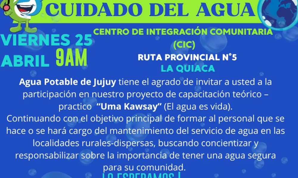 Agua Potable de Jujuy, en el marco del proyecto “Uma Kawsay”, hará una nueva capacitación destinada a fortalecer las capacidades y conocimientos en el manejo responsable del recurso hídrico en Abra Pampa. Esta nueva jornada se llevará a cabo el próximo viernes 25 de abril a las 9 am en el Centro de Integración Comunitaria (CIC) ubicado en Ruta Provincial Nº 5.