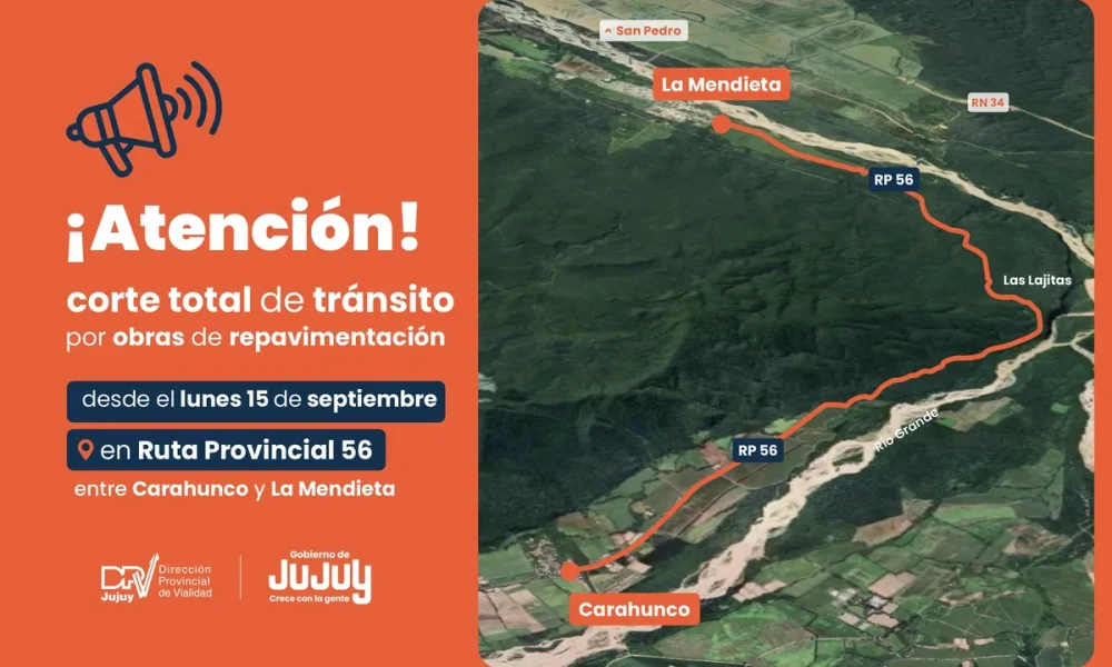 La Dirección Provincial de Vialidad (DPV) informa que desde el lunes 15 de septiembre, entre Carahunco y La Menditeta, la Ruta Provincial 56 (RP 56), permanecerá cerrada, en estado de corte total, para las obras de repavimentación en el marco del Plan Provincial Jujuy Construye.