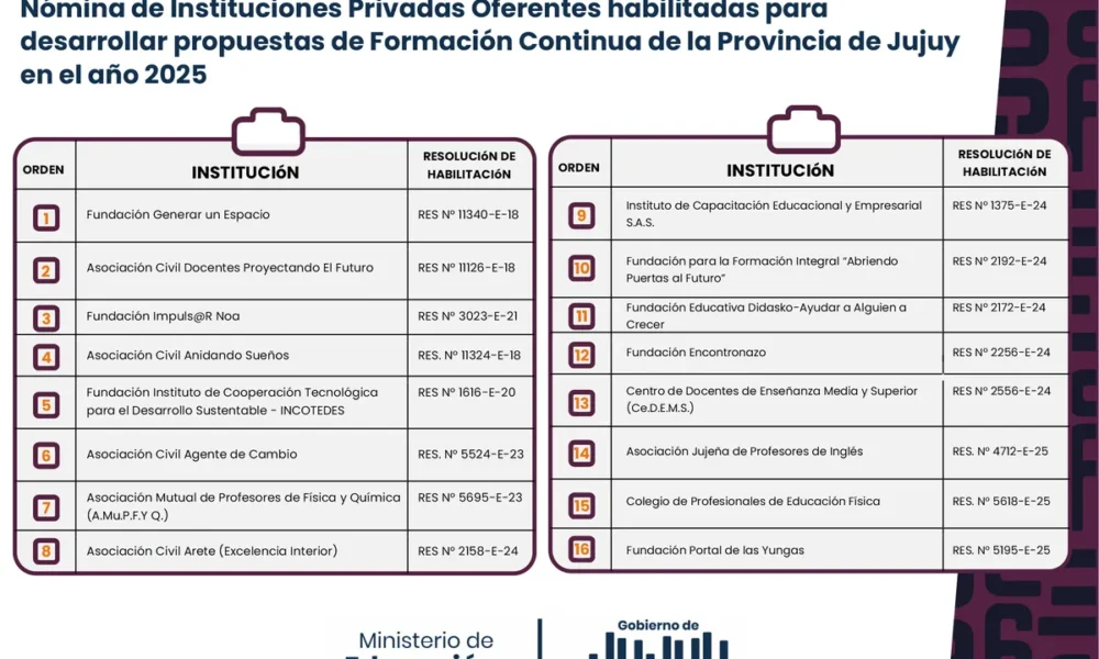 El Ministerio de Educación de la Provincia de Jujuy, a través de la Unidad de Formación Continua de Instituciones Oferentes dependiente de la Secretaría de Planeamiento Estratégico, informa a la comunidad educativa la nómina actualizada de las Instituciones Privadas habilitadas para ofrecer propuestas de Formación Continua en el año 2025.