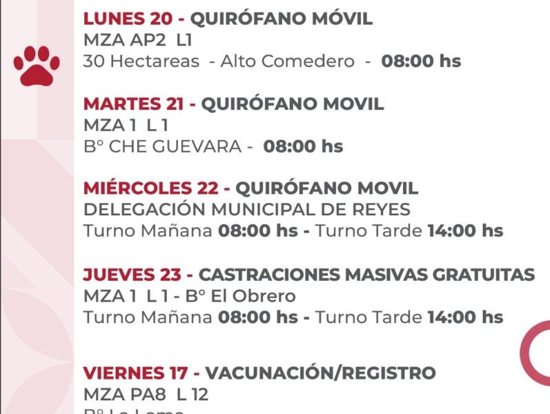 La Dirección de Zoonosis de la Municipalidad de San Salvador de Jujuy dio a conocer el cronograma de actividades correspondiente a la próxima semana, que incluye operativos de quirófano móvil, castraciones masivas y jornadas de vacunación y registro de mascotas en distintos puntos de la ciudad.